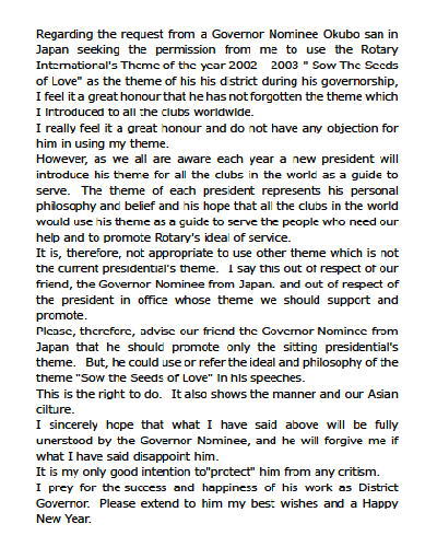 大久保様がビチャイ元RI会長年度のRIテーマをご使用されたいとのお話は、個人的には大変光栄なことでございます。しかしながら、各年度のRI会長がRIテーマをかかげられます。その年度のRIテーマを世界の地区、クラブがそのテーマに沿っての活動をされることでしょう。大久保様のご希望は大変有難いお話ですが、やはりその年度のRI会長のRIテーマに敬意を表すべきかと思います。